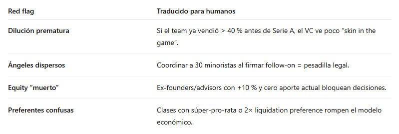 - Varios deals abortados en Serie A cuando el due-diligence reveló capital “muerto” (> 15 %) y decenas de SAFE convertidos con términos distintos. Los VCs pidieron un recap; los founders no pudieron cerrar antes del run-way crunch.