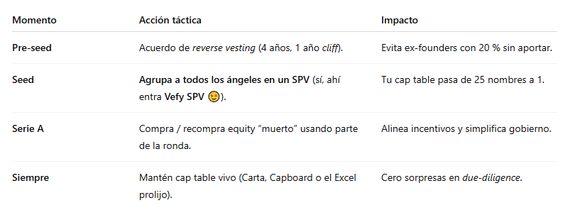 En un mercado más selectivo que nunca, el cap table sucio es el asesino silencioso de rondas. La buena noticia: con disciplina y herramientas (hola, Vefy SPV), puedes pasar la escoba antes de que sea tarde.